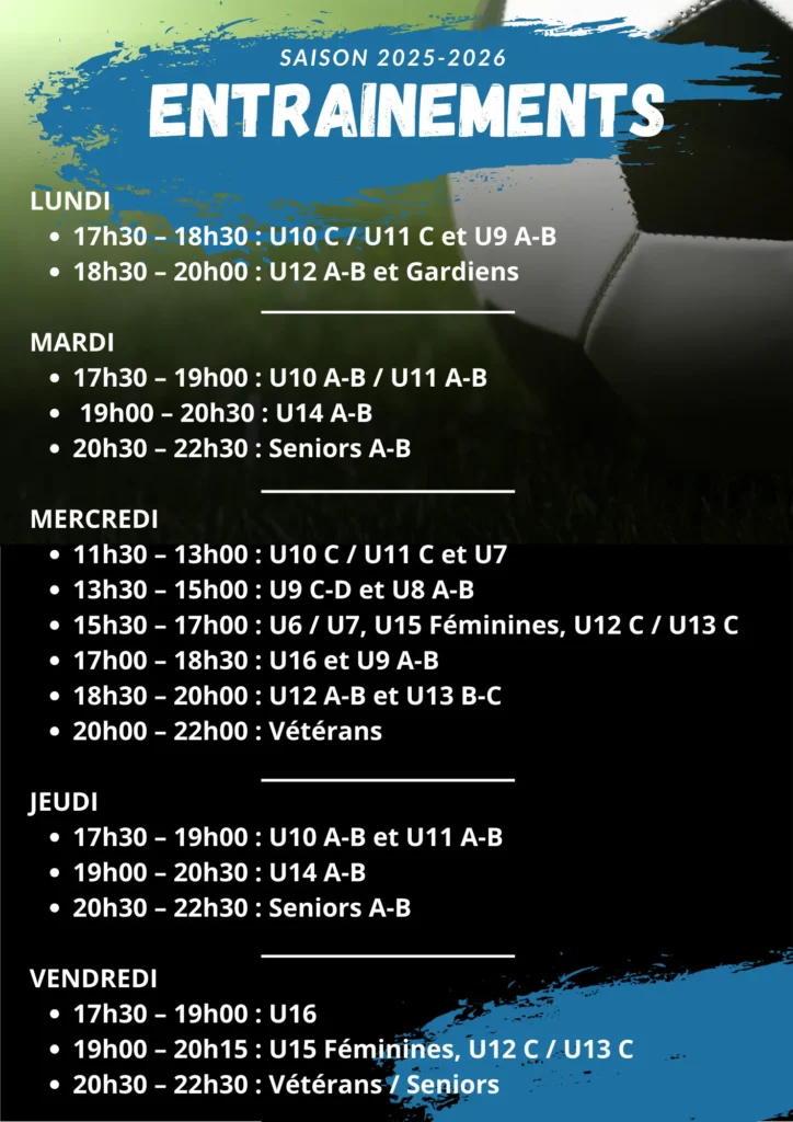 Les horaires d’entraînement sont pensés pour s’adapter aux différentes catégories et favoriser le développement sportif, personnel et social de chaque licencié, des plus jeunes aux seniors. Le club veille à offrir un cadre structurant, bienveillant et accessible, permettant à chacun de progresser à son rythme tout en portant fièrement les couleurs du VFA.